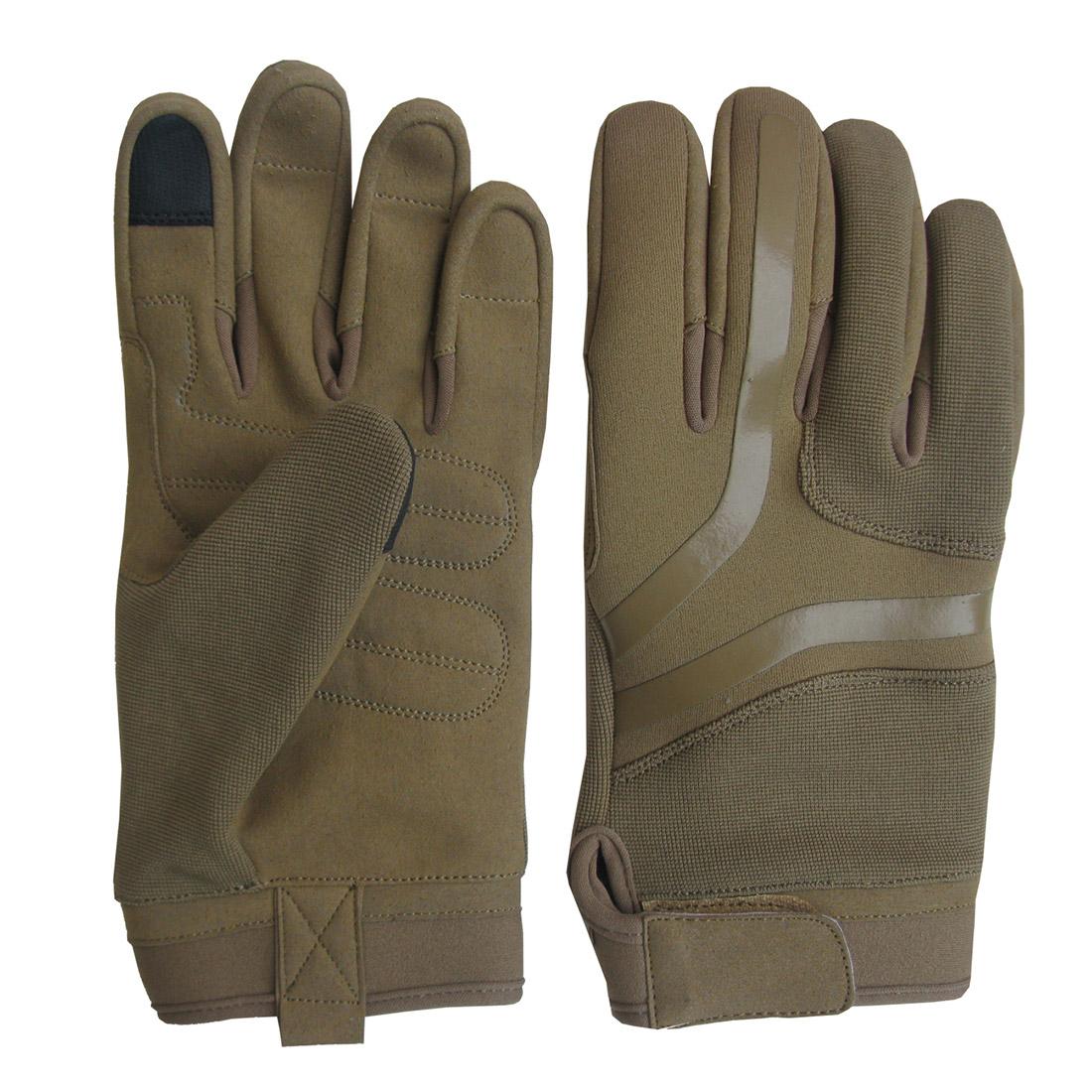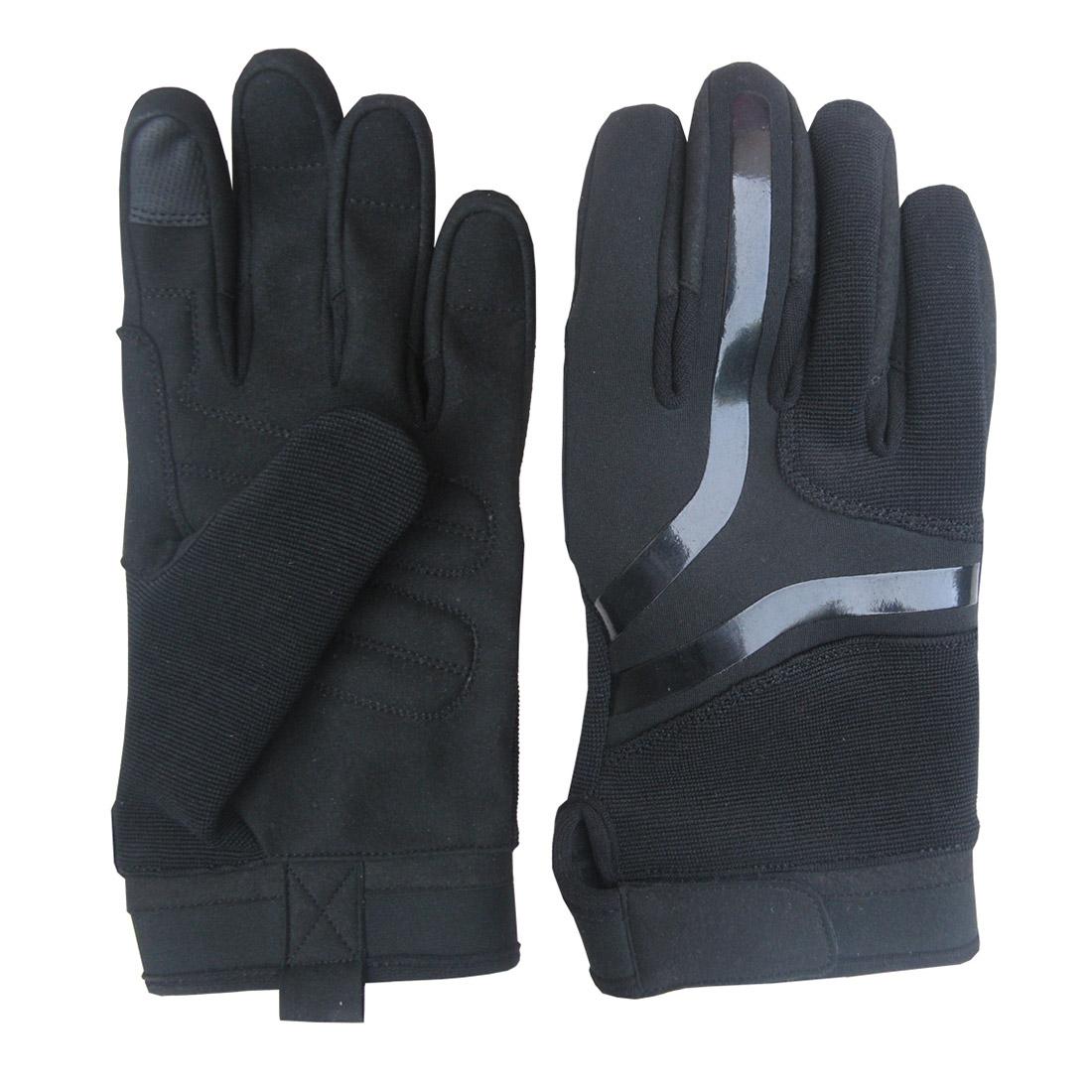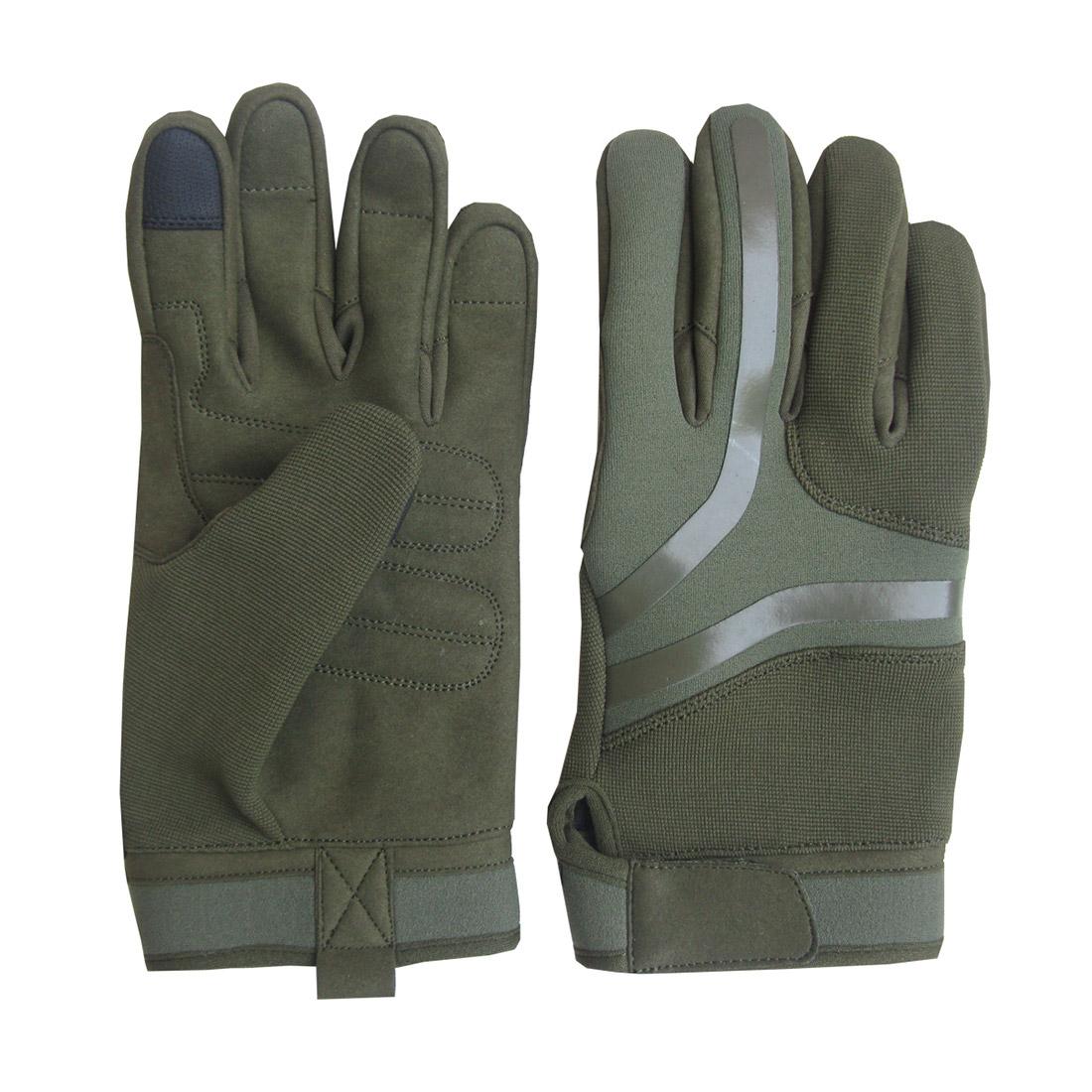 Shell: Artificial leather, spandex, neoprene, silicon printing on back side of hand, needle protection on fingers, Touch screen function on first finger & thumb, polyester lining, adjustable Velcro strap.